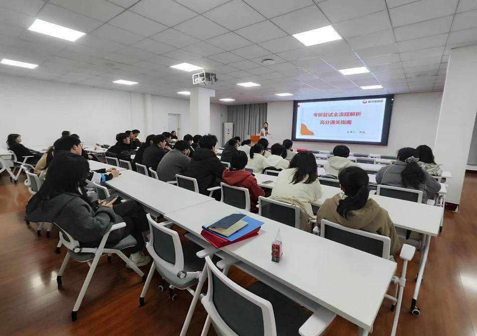 考研复试在即,为帮助英国365集团官网2026届考研学子精准把握复试关键节点,明晰面试流程与技巧,缓解备考焦虑,提升复试竞争力,3月11日晚,学院特邀请新文道考研周欣老师,为全院备考学子开展考研面试专题指导讲座,讲座覆盖复试全流程,干货满满,现场学生反响热烈。周欣老师结合自身丰富的辅导经验,围绕复试流程、面试技巧、复试调剂三大核心内容,为学子们进行了精准指导,针对性解决备考痛点。活动现场互动热烈,周欣老师耐心解答学...