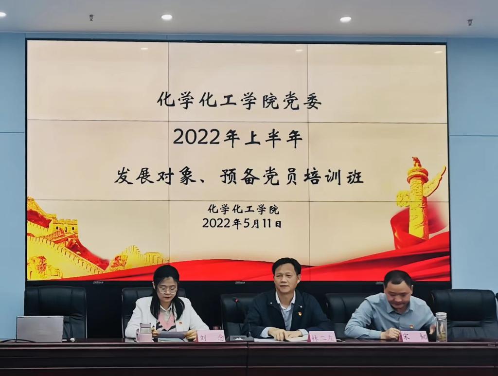 为加强对党员发展对象的教育培训,进一步明确发展对象的入党动机,增强理想信念,2022年5月11日下午15:00,化学化工学院召开2022年上半年发展对象(校第195期)及预备党员培训班,化学化工学院党委书记林二友、材料科学与工程学院党委书记宋韧、化学化工学院党委副书记刘念出席开班仪式。