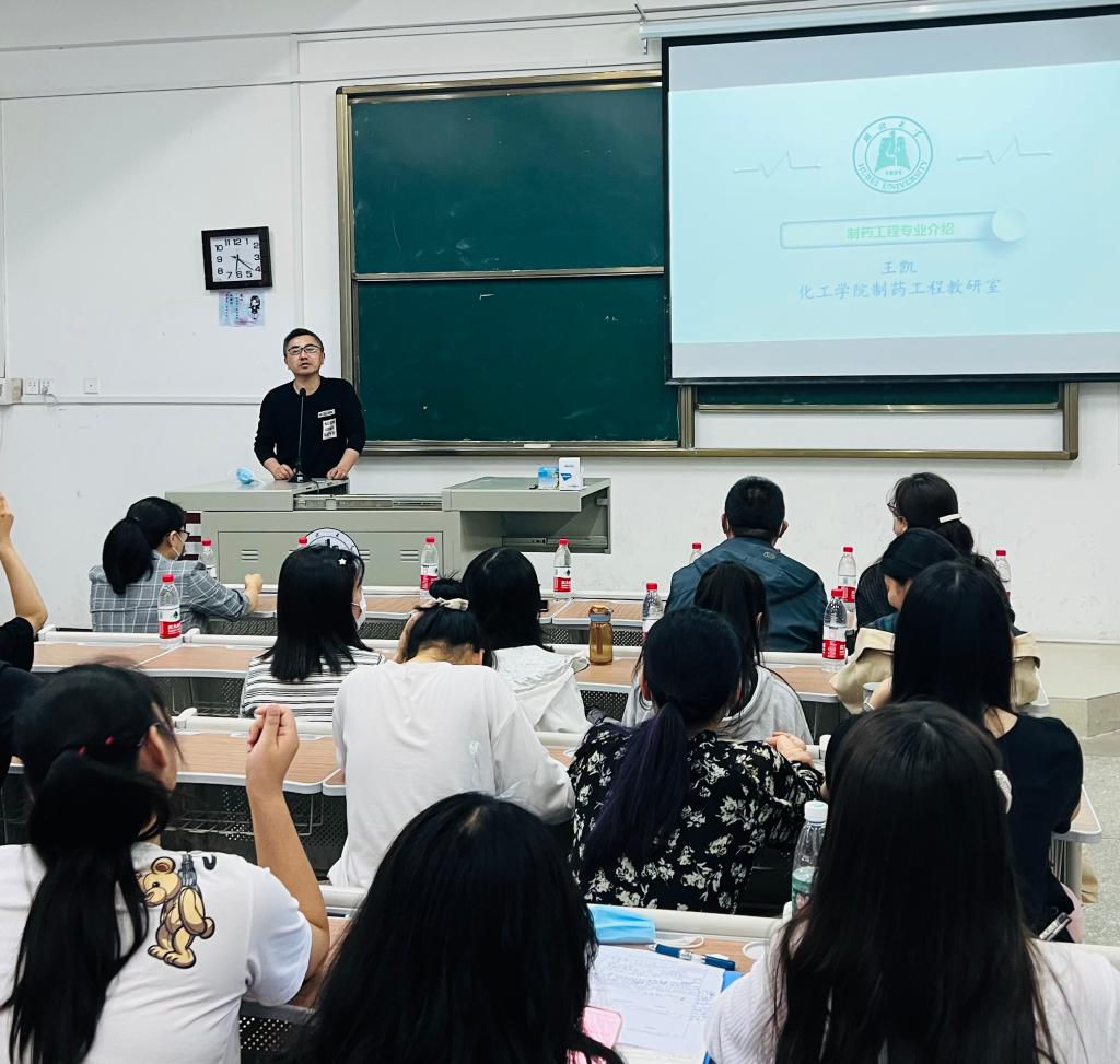 副院长、制药工程系王凯教授首先介绍了英国365集团官网的对于本科生的教育培养模式:入学第一年接受重基础的通识教育,第二年开始,学生可根据自身职业规划以及学科兴趣进行专业选择。随后,王凯教授向2021级本科生介绍了制药工程这一新兴专业“厚基础、宽口径、重实践”的专业特色。