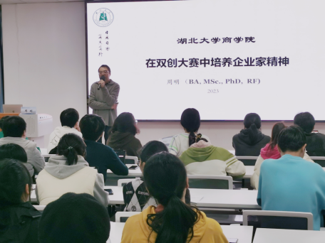 讲座伊始,周明老师以常见的生活现象——“大学生90%的创业都会失败”为例引出创业的本质,通过讲解创新创业竞赛的选题、前期规划、PPT展示、团队分工等内容,认真分享了“双创”竞赛的宝贵经验。