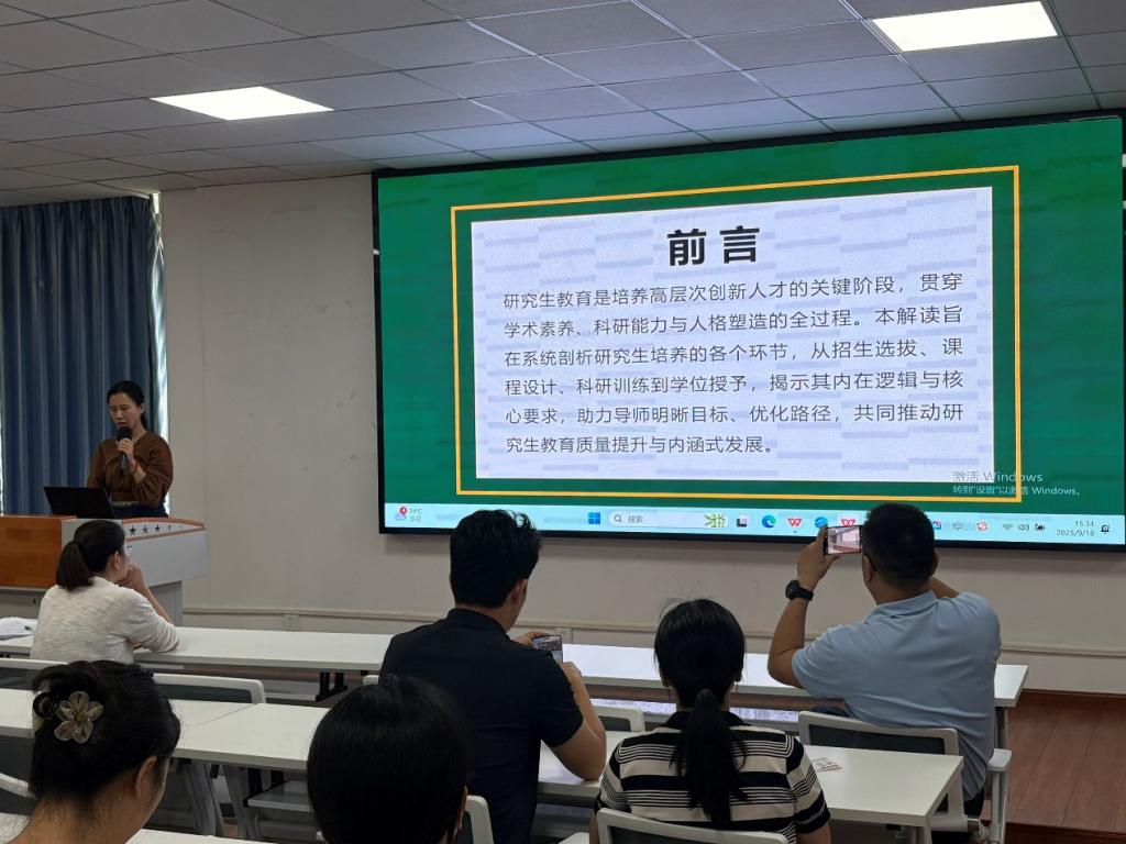 2025918日,学院在D216会议室举办了“践行立德树人使命,深化新时代师德师风建设”导师培训系列活动第二场讲座:研究生培养全过程解读。本次讲座由学院研究生秘书张絮主讲。