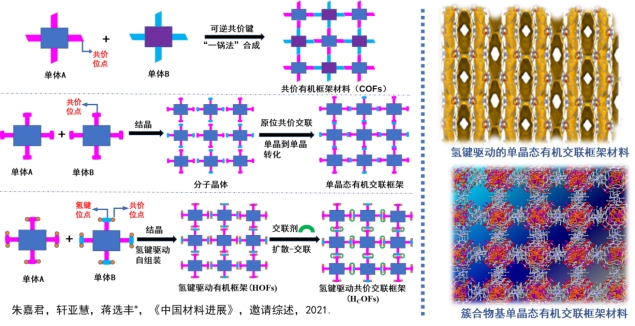 (3)金属簇基单晶态有机共价交联超分子框架材料的模块化自组装、结构调控与性能研究。结合COFs和HOFs, SOFs的优点,运用单晶到单晶转化交联方法(SCSC),成功实现了晶体内部高度有序地光照诱导共价交联,最终合成了一类具有更高的化学稳定性的高单晶态有机共价框架材料(hydrogen-bonded cross-linked organic frameworks,HcOFs)。这类单晶态超分子框架材料最大特点是具有宏观可视弹性,可以高效吸附富集水中放射性碘。该项目中部分成果发表在国际化学顶尖期刊《美国化学会志》上(JACS, 2017, 139 (21), 7172; JACS, 2019, 141, 10915; Chem, 2021; Microporous and Mesoporous Materials, 2022, 345, 112261; Chemistry Letters, 2022, 51, 902-905; Journal of Environmental Chemical Engineering, 2024, 12, 112394;Microporous and Mesoporous Materials, 2024; Journal of Hazardous Materials, 2024; Chemical Engineering Journal, 2025, 505, 159606等)。基于此策略,课题组采用主-客体作用、配位键和金属成键作为驱动力,模块化分级自组装成含有高核原子簇的单晶态有机共价交联超分子框架材料,并研究这材料的微观晶体结构和功能。